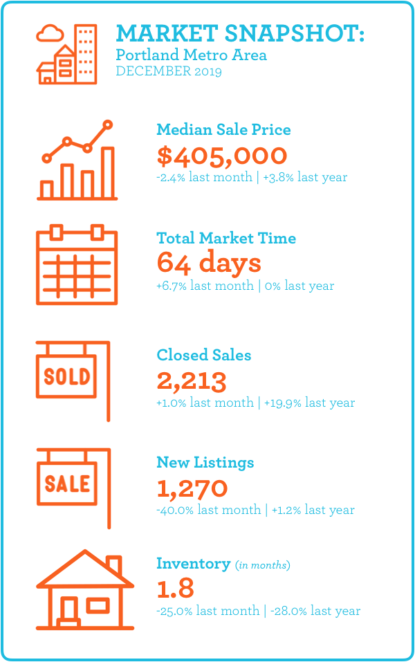 Looking at the last month of last year (and last decade!) we see a lot of positive activity in the Portland Metro Area. Compared to the previous December, new listings increased by 1.2%, closed sales were up almost 20% and the Median Home Price increased by 3.8%. Inventory fell by 28% to 1.8 months - the lowest we’ve seen in almost two years. As with nearly every month of 2019 (January being the only exception), the Median Home Price in December ($405,000) was the highest we’ve ever seen for that month. This caps off a final push of 2019 that saw prices increasing at a higher rate at the end of the year than during the typically busier months of spring and early summer. In most years we see the market slow down in the fall and early winter and start to pick back up again in the new year. In 2019 we didn’t see that slowing down in the last couple of months: in addition to New Listings increasing in December, Pending Sales also increased by over 10% from the previous year, leading us to believe that January and the first few months of 2020 will likely be busier than usual.